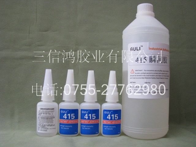 深圳市三信鸿胶业有限公司生产销售的“固力”400快干胶系列。低白化,高强度。通用及常用型其对于金属、塑胶、橡胶以及惰性材料与常规材料粘接。415其粘度高,决定其填充性;可达填充缝隙之间,起到快速固定和粘接作用,其成分:a -氰基丙烯酸甲氧基乙酯Methoxyethtl cyanoacrylate Adhesive低白化,低气味,单组份,中速固化,粘接材料广泛,特别适用于P+R...