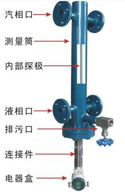 图中的内部探极和测量筒构成电容式传感器,汽相口和液相口分别和锅炉汽包的法兰相对接,利用连通器原理将锅炉中的液体引入测量筒,而探极位于测量表筒的中心位置,液体的流入或界面的变化引起传感器内电极与测量表筒内壁之间的介电常数发生变化,从而引起电容量的变化。此时,由传感器将此电容量的变化采集并送之电器盒,再由电器中的电路板转换成4-20mA信号输出,则此时被测出的测量筒内的介质高度就是设备内介质的高度,从而实现对设备内介质的测量。