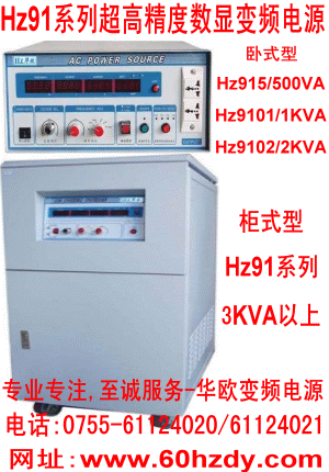 华欧变频电源公司专业生产的产品为:★Hz81系列数位可编程单相变频电源-按键式(300VA-200KVA)★Hz91系列超高精度单相变频电源-旋钮式(500VA-200KVA)★Hz93系列三相变频电源-旋钮式(3KVA-500KVA)深圳市华欧变频电源专业生产销售台湾变频电源系列www.60hzdy.com电话:0755-61124020/61124021 传真:0755-61124023谢小姐13570876572